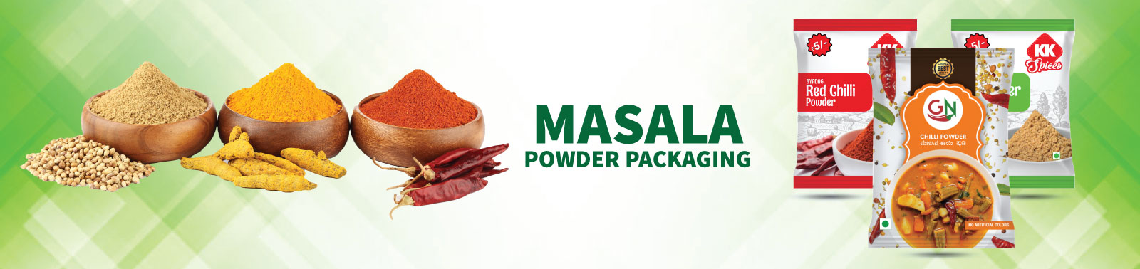 Masala Powder packaging refers to Packaging of Powders like : Chilli, Turmeric, Coriander, Sambar, Garam Masala, Puliyogare Masala, Vangibath Masala, Biriyani Masala, Chicken Masala, Fish Curry Masala, Mutton Masala, Fish Fry Masala, Jeera powder, Palav Masala, Chat masala, Pani Poori masala & Various Indian Masala Powders